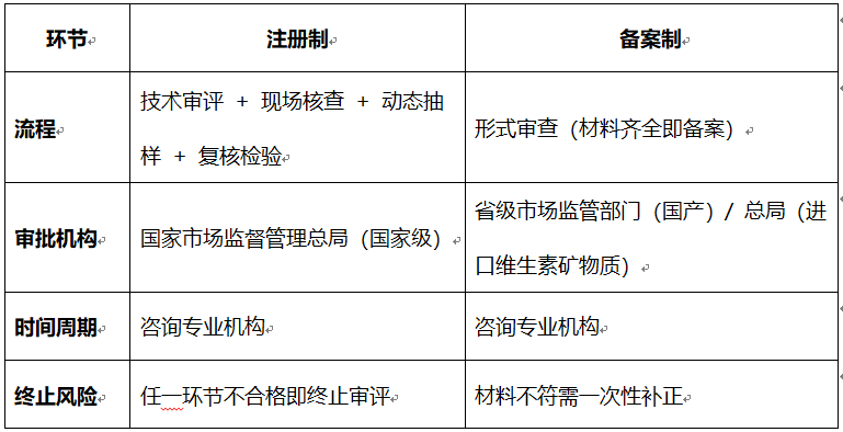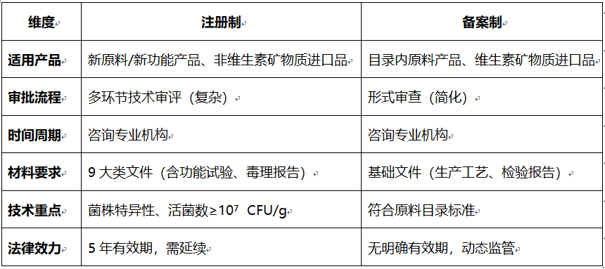 o 注册制需提供菌株级安全与功效数据(同一菌种不同菌株功效可能不同),而备案制原料已预审,无需重复验证。