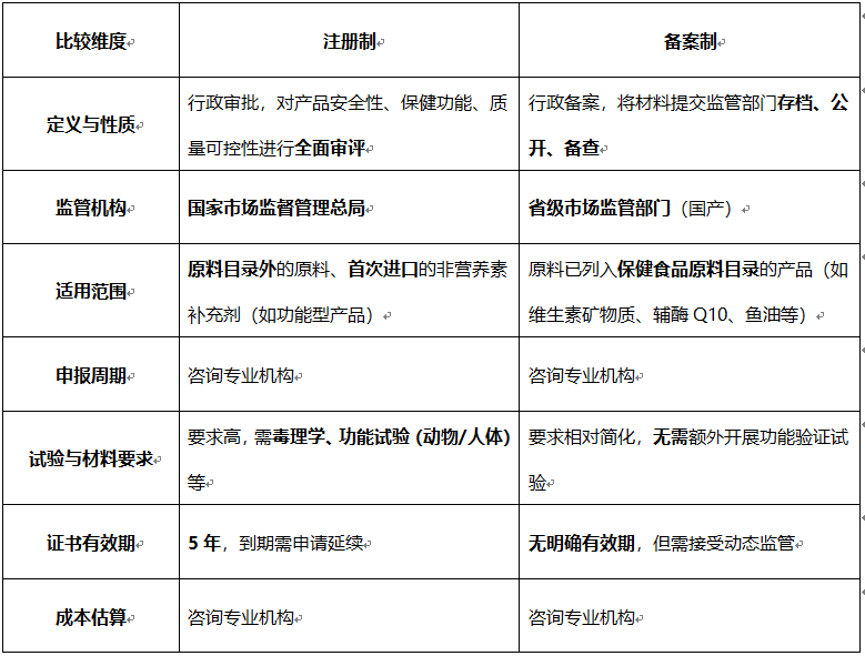 • 注册:适用于使用《保健食品原料目录》外原料的产品,以及首次进口的、属于非维生素矿物质类的保健食品(如一些功能型产品)。