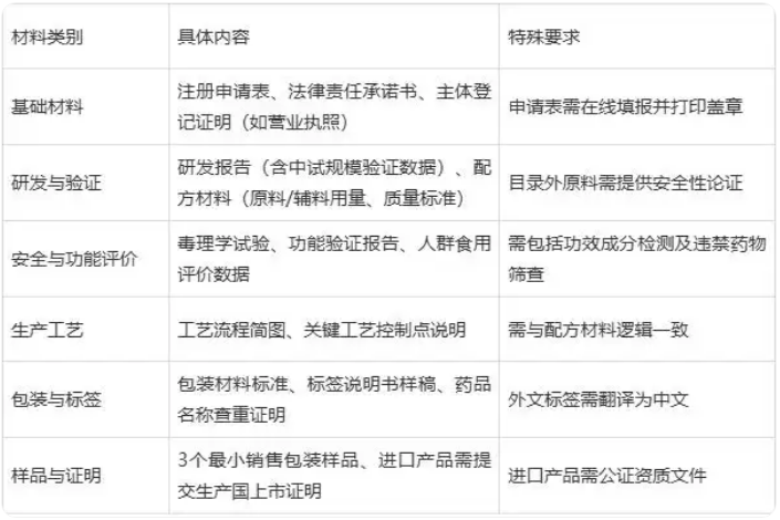 •材料准备:包括研发报告、配方工艺、安全性评价等10类核心材料(详见下文材料清单);