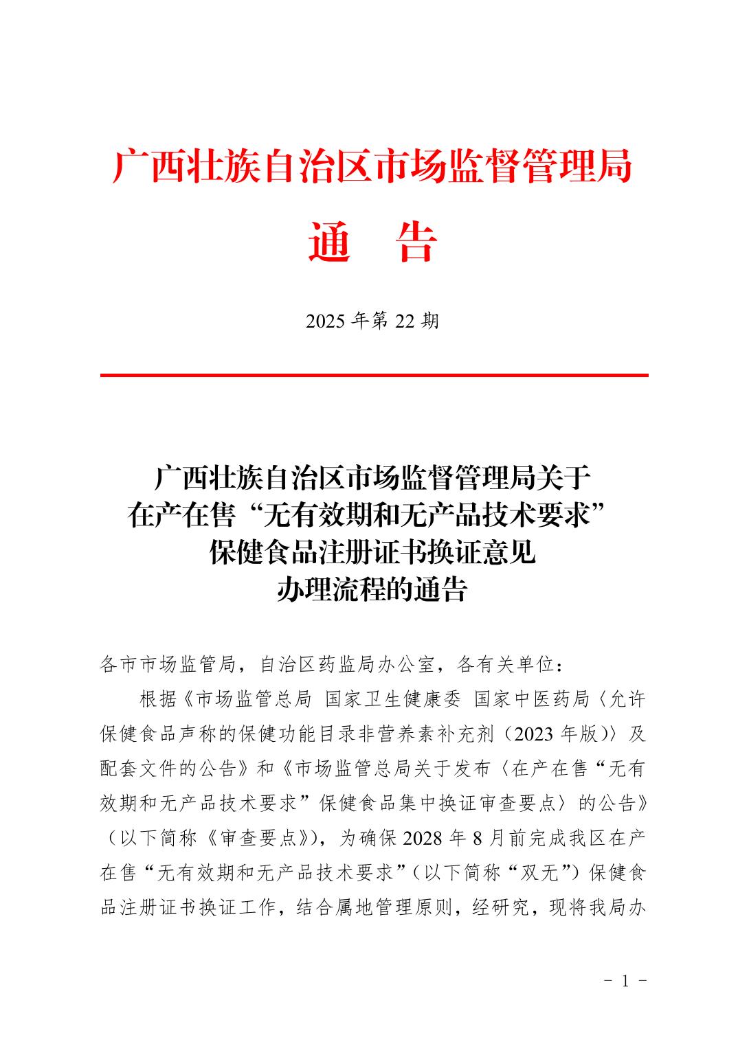 广西壮族自治区市场监督管理局关于在产在售“无有效期和无产品技术要求”保健食品注册证书换证意见办理流程的通告