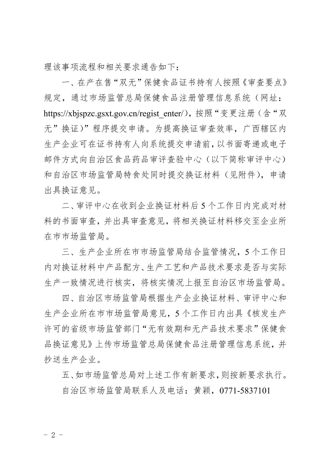 广西市场监督管理局关于在产在售“无有效期和无产品技术要求”保健食品注册证书换证意见办理流程的通告